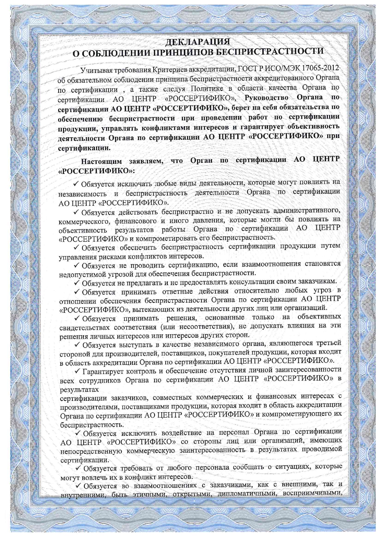 Вы находитесь здесь : Центр Россертифико » Декларация о соблюдении принципов беспристрастности
